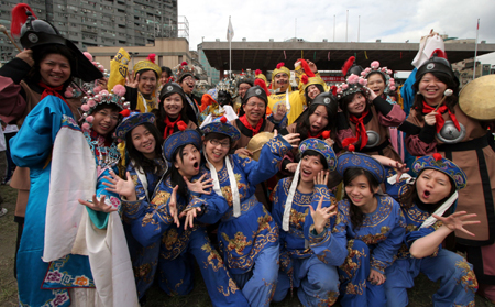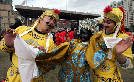 據(jù)“中央社”報道,表演藝術(shù)研究所師生穿上傳統(tǒng)服飾,演出媽祖出巡祈福劇目。其中,飾演“黑面媽祖”與護(hù)駕的三位同學(xué)更以“俏皮”扮相博得喝彩。(黃自強(qiáng))