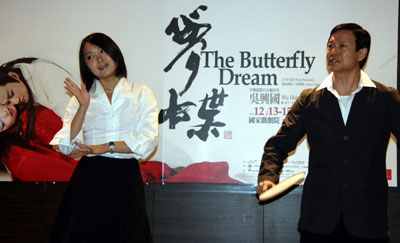 中新網(wǎng)11月2日電 據(jù)“中央社”報(bào)道,臺(tái)灣當(dāng)代傳奇劇場(chǎng)新創(chuàng)昆曲風(fēng)歌劇《夢(mèng)蝶》十二月十三至十六日將在戲劇院演出。在昨天的記者會(huì)中,作為男女主角的京劇名角吳興國(guó)(右)與昆曲名伶錢熠(左)現(xiàn)場(chǎng)表演一段“搧墳女與莊周”。