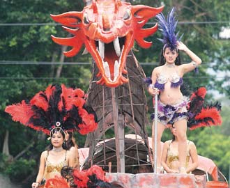 中新網(wǎng)11月5日電 據(jù)臺(tái)灣《聯(lián)合報(bào)》報(bào)道,臺(tái)北2007北投藝術(shù)嘉年華昨天熱鬧踩街,現(xiàn)場(chǎng)數(shù)十組花車隊(duì)伍爭(zhēng)奇斗艷,還有小丑踩高蹺,辣妹熱情的桑巴舞游行車隊(duì),也讓許多人駐足觀賞。