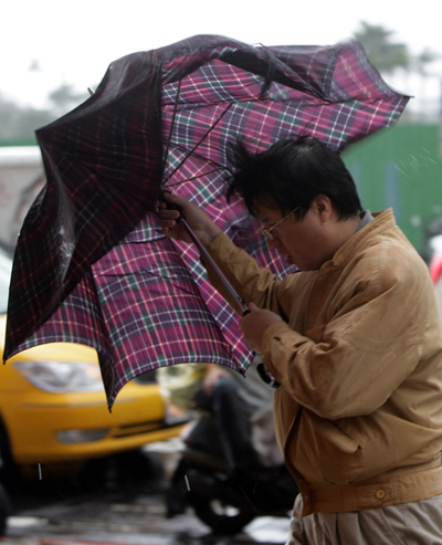 米塔臺風二十六日下午已轉(zhuǎn)為輕度臺風,臺灣氣象部門預測米塔臺風暴風圈將會縮小,但外圍環(huán)流與鋒面共伴效應為臺灣島北部及東部帶來的豪雨仍會持續(xù)。圖為行人在雨中艱難行進!爸醒肷纭眻D 張皓安 攝