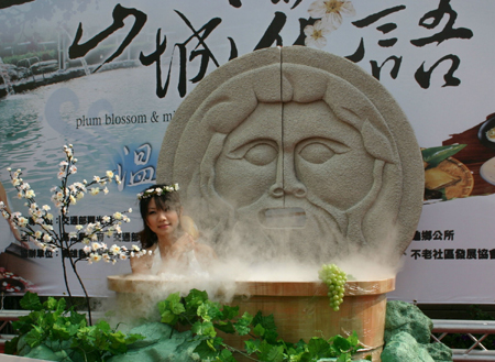 臺灣高雄縣溫泉餐飲業(yè)者推出“山城花語溫泉季”活動,四日記者會中的辣妹泡湯,凸顯活動主題!爸醒肷纭眻D 陳守國 攝