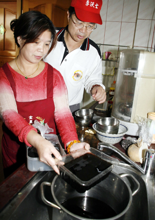 金門(mén)縣金寧鄉(xiāng)安岐村住戶(hù)自來(lái)水管,二十五日中午流出黑色污水,嚇壞村民。“中央社”圖 倪國(guó)炎 攝