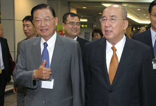 中國國民黨主席吳伯雄(右)五月三十一日結(jié)束在大陸的訪問行程返臺,;鶗麻L江丙坤(左)特別前往接機(jī),并豎起大拇指高度肯定此行的成果。(“中央社”圖)