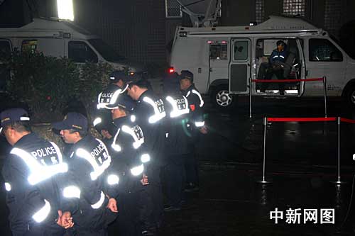 12月29日下午2時,臺北地方法院開始召開羈押庭,就是否收押陳水扁做出裁決。時間已過去十一個小時,最終裁決仍未有結(jié)果。圖為臺北地方法院靠近司法警察室的側(cè)門口。警察仍在戒備。(圖文/陳立宇)