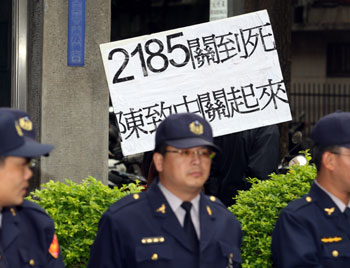 臺北地方法院21日審理陳水扁家庭洗錢案,庭外有民眾舉牌“把陳致中關(guān)起來” “中央社”圖