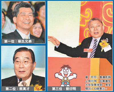 今年上榜富豪中僅5人錄得資產(chǎn)增長,當(dāng)中3人得益于大陸業(yè)務(wù)發(fā)展!按筅A家”是旺旺集團(tuán)創(chuàng)辦人蔡衍明,集團(tuán)在大陸發(fā)展強(qiáng)勁,身家急漲10億美元,排名從第9名跳升至第3名。另一食品集團(tuán)康師傅的創(chuàng)辦人魏應(yīng)州,身家也大增5.5億美元,升至第5名。