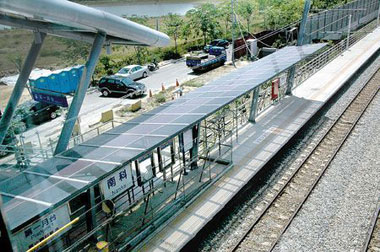 4月22日是世界地球日,臺(tái)南縣環(huán)保局及縣府工務(wù)處22日聯(lián)合在南科車站宣導(dǎo)綠能科技,臺(tái)南縣長(zhǎng)蘇煥智說(shuō),臺(tái)鐵南科站六月底啟用,除太陽(yáng)能發(fā)電具有綠色科技概念,因?yàn)檐囌就ㄜ,通勤族可利用大眾運(yùn)輸系統(tǒng)到南科園區(qū)各廠上班,先搭火車到南科站,再搭園區(qū)接駁車,更能有效節(jié)能減碳。