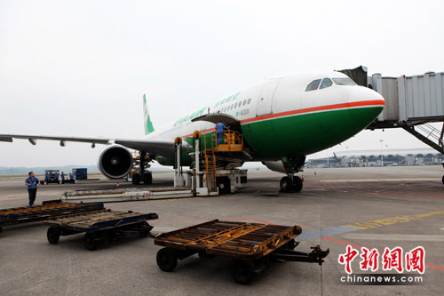 中新網(wǎng)重慶5月26日電 (記者 郭晉嘉)隨著富士康、英業(yè)達(dá)等臺(tái)企入駐重慶,今年以來渝臺(tái)直航航線客運(yùn)持續(xù)火爆,貨運(yùn)開始升溫。5月26日,臺(tái)灣立榮航空的B7192航班由麥道90機(jī)型改為252座的空客330機(jī)型執(zhí)飛,這是重慶—臺(tái)灣航線首次采用大型寬體機(jī),也是首次大批運(yùn)送貨物。