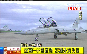 空軍司令部指出,該架F-5F戰(zhàn)機(jī)編號(hào)5410,上午11時(shí)14分由清泉崗基地起飛,前往澎湖石礁靶場(chǎng)執(zhí)行對(duì)地訓(xùn)練課目,11時(shí)36分時(shí)戰(zhàn)機(jī)光點(diǎn)消失。