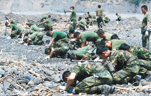 另外,在六龜鄉(xiāng)新開部落搜救的臺軍官兵,昨天趴在可能埋尸的土石流現(xiàn)場,用鼻子聞土壤中有無酸味,再用鏟子挖土,希望找到罹難者遺體,可惜尚無所獲,他們表示,“雖然很累,但為了罹難者也要拚下去!