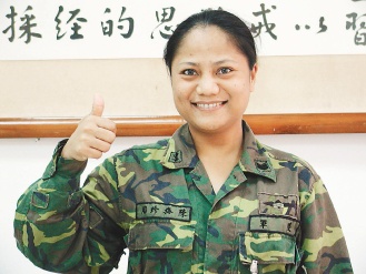 38歲陳梅珍從小想當護士,中學畢業(yè)考上護專,但學費貴,家里無力負擔。念完高中后,為減輕父母負擔,入伍成為臺軍首批志愿役女士官。現(xiàn)在是陸軍空降訓練中心士官長,去年協(xié)助訓練連上人員,獲得“莒光連隊”殊榮。