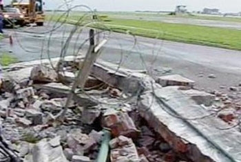 這輛拖掛車(chē)車(chē)頭撞得扭曲變形,還把圍墻撞下一大塊,更讓人緊張的是,它撞壞的是花蓮空軍基地的外墻,目前“漢光”演習(xí)正在進(jìn)行,軍用飛機(jī)全讓外界看光。