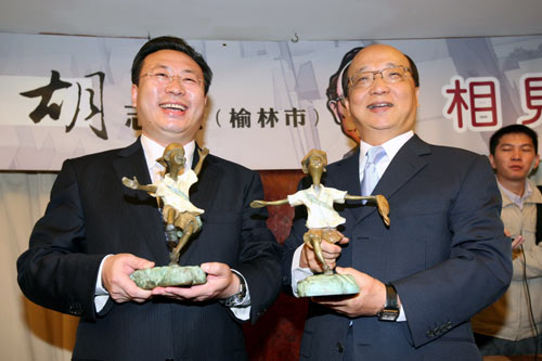 據(jù)“中央社”報道,臺中市長胡志強今天在臺中與陜西榆林市長胡志強相見歡,臺中市長胡志強特別請雕塑家余燈銓創(chuàng)作一組“阿吉、阿祥”的“相見歡”雕像,送給榆林市長胡志強;他還開玩笑的說“兩強相會,強中自有強中手”。