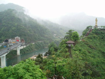 大約10分鐘,就爬上了觀音臺。觀音臺立有一座四十尺高,以青銅鑄造的觀音圣像,下方另一平臺,有一圓頂?shù)牡钐,祀奉觀音神像。觀音臺上,居高臨下,眺望遠近山水,俯瞰坪林聚落,景色怡人。觀音臺步道沿途亦無遮蔭,陰涼天氣或雨中來訪皆宜,惟不宜艷陽高照日。