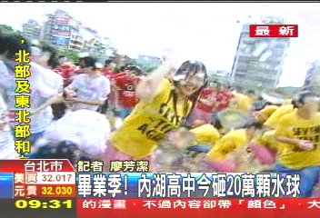 中新網(wǎng)5月20日電 據(jù)臺(tái)灣TVBS報(bào)道,每年一到畢業(yè)季,最引人注目的就是內(nèi)湖高中傳統(tǒng)的砸水球,今年學(xué)生們準(zhǔn)備了20萬(wàn)顆水球,歌手郭采潔也來(lái)獻(xiàn)唱,現(xiàn)場(chǎng)好不熱鬧。