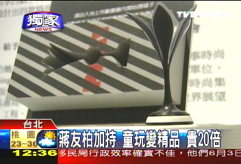 中新網(wǎng)5月14日電 據(jù)臺灣TVBS報道,蔣家后代蔣友柏設(shè)計過許多產(chǎn)品,目前正式跨足臺灣玩具市場。蔣友柏花了2年時間,設(shè)計了包括毽子、竹蜻蜓等一系列兒童玩具,用PVC材質(zhì)制作,造型非常時尚,也因為有了蔣友柏加持,一個小玩具居然要賣590元新臺幣。