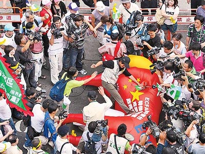 在臺(tái)北游行的一些綠營民眾因不滿馬英九與大陸簽署經(jīng)濟(jì)合作架構(gòu)協(xié)議(Economic Cooperation Framework Agreement,ECFA),準(zhǔn)備了紅色巨型充氣馬玩偶,上面畫有我五星紅旗標(biāo)志,還寫著“ECFA傾中賣臺(tái)”等文字,并煽動(dòng)民眾踢踹泄憤。