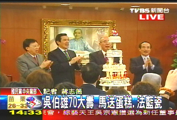 慶祝吳伯雄70歲大壽,包括馬英九、劉兆玄、王金平等人都到場(chǎng)致賀,給足面子,而馬英九也送上5層樓高的蛋糕,以及一個(gè)上面寫著“伯雄中興”的法藍(lán)瓷,國(guó)民黨“立委”洪秀柱更獻(xiàn)吻祝福。
