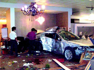 據(jù)臺(tái)灣《聯(lián)合報(bào)》報(bào)道,位于蘭陽(yáng)大橋南端的家具行前晚11時(shí)許還在營(yíng)業(yè),店員正帶客人看家具,突然聽到“吱”一聲尖銳摩擦聲,接著“轟”的一聲,整臺(tái)銀色小轎車側(cè)撞進(jìn)來,迎路整片落地玻璃撞碎,家具被撞飛,霹靂啪啦一片狼藉。