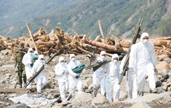 中新網(wǎng)8月20日電 臺(tái)軍部隊(duì)以及相關(guān)搜救人員連日來持續(xù)在高雄縣小林村等重災(zāi)區(qū)陸續(xù)搜索罹難者遺體,當(dāng)?shù)匕l(fā)現(xiàn)30幾處地面滲出血水,19日,搜救人員發(fā)現(xiàn)部分尸塊,推測是媽媽抱著小兒子逃命,卻不幸被傾流而下的巨大土石流掩滅。消息傳出,村人不勝唏噓。