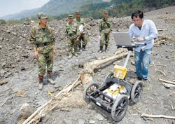 搜救人員表示,今天會(huì)再運(yùn)送兩臺(tái)儀器到小林村幫組搜尋,因?yàn)?zāi)難發(fā)生當(dāng)時(shí)很多人在屋內(nèi),故會(huì)先用儀器探測找出房舍再開挖。他們介紹儀器說,“電磁波探測儀”用來找尋地面下的石油、探礦,探測深度達(dá)十米;“透地雷達(dá)”則是發(fā)射雷射波,探測地面下是否有物體存在。