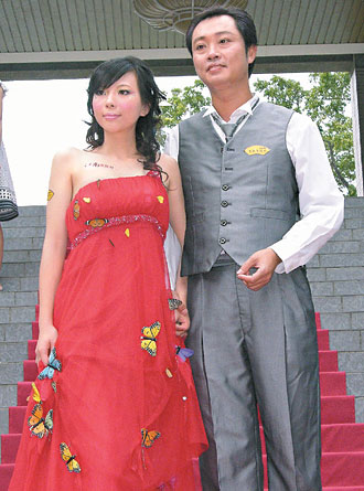 中新網(wǎng)8月27日電 10月舉行婚禮的準(zhǔn)新娘陳韻如,26日試穿一款“蝴蝶禮服”,紅色低胸禮服上,“停”著30多只活體蝴蝶,遠(yuǎn)望仿佛蝴蝶彩繪圖。不過,十分鐘后,緞面禮服上動也不動的蝴蝶突然展翅飛舞,驚艷全場。