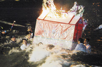 游行過(guò)后,各姓氏宗親會(huì)將水燈頭運(yùn)到望海巷海岸流放入海,象征引領(lǐng)海上亡魂回陽(yáng)間接受供奉。相傳水燈頭越遠(yuǎn),宗親會(huì)來(lái)年的運(yùn)勢(shì)會(huì)越旺,各宗親紛紛默禱,希望自家水燈頭能漂向遠(yuǎn)方。
