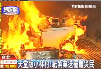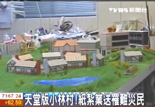 中新網(wǎng)9月4日電 臺(tái)灣“八八水災(zāi)”毀了高雄縣小林村,3日正逢中元節(jié),臺(tái)北縣有家專門制作“天堂配件”的紙?jiān)荆瑸樽屗勒甙蚕,連夜趕工蓋出“天堂版小林村”,里頭除了住家、學(xué)校以及商店街,希望火化后,能讓不幸的罹難者,在天上有棲身之地。