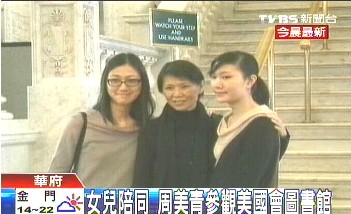 為了云門的歡迎酒會,周美青還特地?fù)Q上了黑色長裙套裝,兩個(gè)女兒馬唯中、馬元中也從紐約趕到華府陪母親,在這個(gè)正式的場合,馬家姐妹也以正式套裝美美亮相,馬唯中和媽媽一樣一身黑,馬元中則是穿上了淺咖啡色小洋裝。