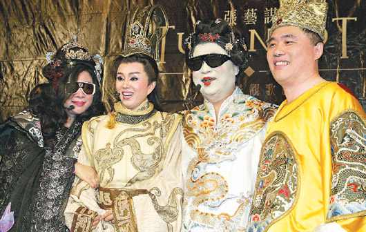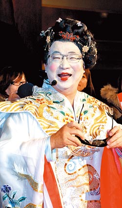 胡志強犧牲“色相”,涂上脂粉、抹成櫻桃小嘴,身著華麗戲服,花一個多小時化妝,才順利變成反串成主角圖蘭朵公主,現(xiàn)場卻有人說“不像公主,比較像藝妓”。郝龍斌則是黃袍加身,扮成皇帝,成了圖蘭朵的父親。陳文茜身著戲服、戴著墨鏡,飾演圖蘭朵的妹妹。孫翠鳳則扮成王子卡拉富,四人妙語如珠,引起哄堂大笑。