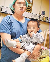 她從銀行回來(lái)后,見(jiàn)兒子坐在報(bào)紙堆上不敢下來(lái)走動(dòng),下午五時(shí)幫兒子換尿布才發(fā)現(xiàn)兒子雙腳腳掌都起大水泡,趕緊將兒子送到高雄長(zhǎng)庚醫(yī)院急救,被診斷有二至三度燙傷,轉(zhuǎn)入燒燙傷病房,至少需住院一周。