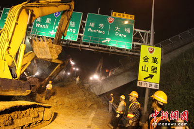 高速公路局北區(qū)工程處長(zhǎng)許鉦漳表示,高速公路局在北二高設(shè)置有土資場(chǎng),以容納災(zāi)區(qū)現(xiàn)場(chǎng)所移置的土石。但經(jīng)過大量卡車清運(yùn)、下雨泥濘濕滑,為了工作人員安全,并增加搶救能量,已經(jīng)決定將土石暫時(shí)移置到臺(tái)北港區(qū)。