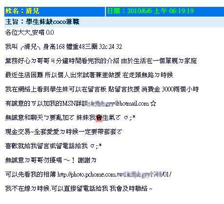 據(jù)報(bào)道,來到高雄縣教師會網(wǎng)頁,點(diǎn)進(jìn)留言板流覽,為人師表的空間怎么會有一則“援交”廣告?廣告上頭不但自稱是大二學(xué)生,還“男女不限”,因?yàn)槿卞X,希望大家“援助”。