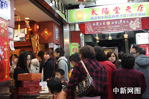 中新網(wǎng)臺(tái)中2月22日電 (屈運(yùn)栩)初到臺(tái)中的人,一定會(huì)被路兩旁零次櫛比,目光應(yīng)接不暇的“太陽(yáng)堂”招牌和店鋪吸引。店鋪里售賣的太陽(yáng)餅是臺(tái)灣最有代表性的特產(chǎn)。春節(jié)剛過(guò),記者走訪了臺(tái)中太陽(yáng)餅老店鋪?zhàn)罴械淖杂陕罚吹礁鏖g老餅鋪前都排起長(zhǎng)隊(duì),一片生意興隆景象。