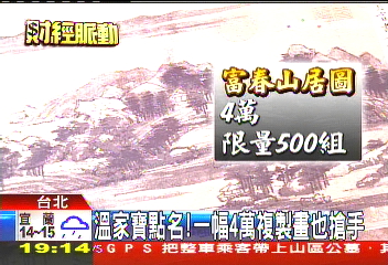 中新網(wǎng)4月24日電 據(jù)臺(tái)灣TVBS報(bào)道,2010臺(tái)北禮品展開跑,臺(tái)北故宮今年第3次參展,也是規(guī)模最大一次。此次臺(tái)北故宮特別把溫家寶提過的富春山居圖制作成復(fù)刻板,限量500套,雖然一幅4萬(wàn)元(新臺(tái)幣,下同),但一開賣就被訂走50套。