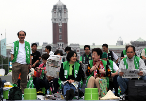 凌晨靜坐民眾逐漸散去,至上午仍在凱道群眾大約剩上千人,主舞臺(tái)區(qū)有民進(jìn)黨主席蔡英文、呂秀蓮、前“行政院長(zhǎng)”謝長(zhǎng)廷、蘇貞昌等人。