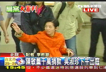 中新網(wǎng)6月15日電 據(jù)臺灣TVBS報道,陳水扁夫人吳淑珍15日下午再次到臺北地方法院開庭,針對前臺北101董事長陳敏熏的千萬捐款,法官傳喚前陳水扁辦公室主任馬永成,還有臺當(dāng)局前“財政部長”林全到庭說明。