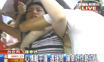 陳幸妤連日來傳出因?yàn)樵庀拗瞥鼍,無法赴美進(jìn)修而心情不穩(wěn),見到媒體提問,對(duì)于陳水扁寫信向馬英九陳情,陳幸妤聽完問題后,變的激動(dòng)情緒崩潰,更一度沖向記者,作勢(shì)要拍打媒體鏡頭。