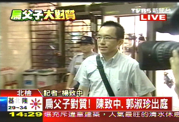 下午14時10分左右,陳致中一身輕便裝扮,準時進入臺北法院,準備到第七法庭開庭。但是由于陳水扁早上的庭訊遲遲未能結(jié)束,所以直到15時47分左右,兩人才見到面。