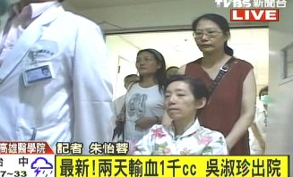 中新網(wǎng)7月10日電 據(jù)臺灣TVBS報(bào)道,陳水扁夫人吳淑珍9日因痔瘡出血,失血過多導(dǎo)致低血壓,送醫(yī)急救,醫(yī)院兩天內(nèi)幫她輸血1000毫升,并與施打鐵劑,身體好轉(zhuǎn),吳淑珍10日下午出院。