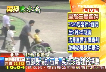 中新網(wǎng)7月16日電 據(jù)臺灣TVBS報道,陳水扁因右腳肌腱炎受傷而打上石膏,吳淑珍16日上午帶著女婿趙建銘,前往臺北看守所探視陳水扁。