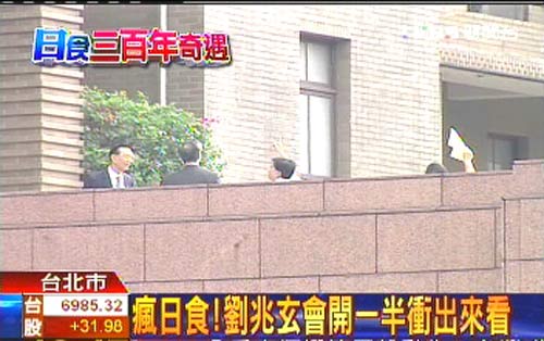 中新網(wǎng)7月22日電 據(jù)臺(tái)灣媒體報(bào)道,盡管臺(tái)灣只能看到日偏食,但民眾“追日”熱情高漲,政治人物也不例外。臺(tái)當(dāng)局“行政院長(zhǎng)”劉兆玄與副手邱正雄等人今天上午在辦公室開(kāi)會(huì),剛到一半就沖到二樓陽(yáng)臺(tái)看熱鬧。