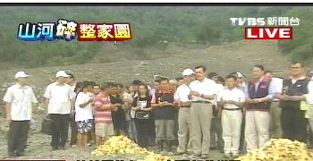 而馬英九到了遭土石掩埋的新開部落,也在當(dāng)?shù)胤傧慵腊萃稣撸袂槟;在進入新開部落前,會經(jīng)過日前災(zāi)民立牌寫著“32人死亡,SOS”的新寶橋,因為橋斷了,施工單位先在河床鋪上便道,讓車子可以通過。