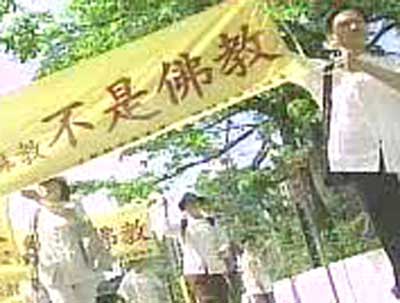 來自臺北的“正覺佛教基金會”成員在高雄巨蛋外舉著布條和標語,高喊“(達賴喇嘛)不是和平者、否定正法、死后必下地獄”等口號。
