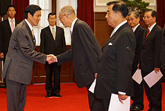 中新網(wǎng)9月10日電 據(jù)“中央社”報(bào)道,臺(tái)當(dāng)局新任“行政院長”吳敦義今天下午率全體“閣員”在“總統(tǒng)府”宣誓就職,司儀逐個(gè)唱名名單,馬英九逐一對(duì)鞠躬“閣員”回禮。