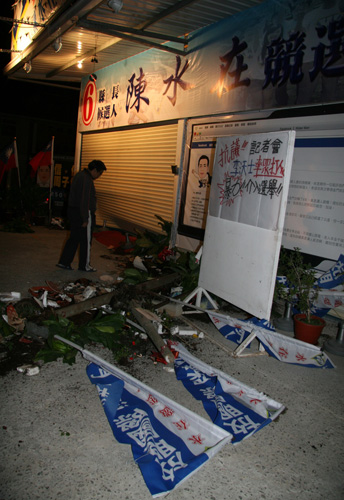 許敬民駕車(chē)撞陳水在競(jìng)選總部時(shí),總部鐵卷門(mén)已經(jīng)拉下,內(nèi)部無(wú)人,但將鐵卷門(mén)撞凹,門(mén)外的旗幟撞得東倒西歪,盆栽破碎一地。