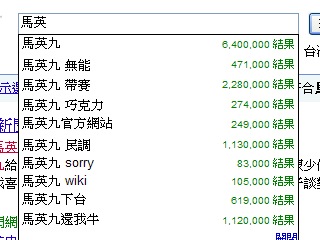 記者實(shí)際在Google上網(wǎng)搜尋,以馬英九為例,才打上“馬英”二個(gè)字,Google搜尋網(wǎng)頁(yè)上赫然自動(dòng)跳出“馬英九,無能”,或是“馬英九,帶賽”等搜尋建議條件;在雅虎奇摩進(jìn)行同樣搜尋時(shí),則有十項(xiàng)搜尋建議產(chǎn)生,但無“無能”或“帶賽”的搜尋建議。