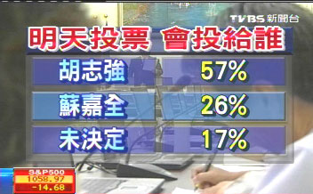 報道稱,誰才是大臺中市民心中理想的第一屆市長?TVBS民調(diào)中心,在5月25日晚間做出的最新民調(diào)顯示,假如明天就是投票日,將有57%的大臺中市民投票給國民黨籍的胡志強,26%投給民進黨籍的蘇嘉全,差距有31個百分點,尚未決定的比例則有17%。