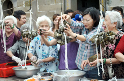第1次包粽子的蔡英文,在眾婆婆媽媽指導(dǎo)下,開(kāi)心地包粽子,她說(shuō),包粽子最困難處在把粽葉合起來(lái)的剎那。