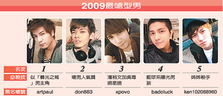 奪得去年年度總冠軍的型男森田是職業(yè)模特兒,曾擔(dān)任“今天你要嫁給我”MV男主角,也拍過(guò)電廣告,外型酷似電影“暮光之城”男主角羅伯派丁森。第二名的世新大學(xué)新聞系大三生吳東穎,外型帶點(diǎn)壞男人的味道。他每周會(huì)到誠(chéng)品三、四次,從雜志上得知最新流行信息,參考風(fēng)格。